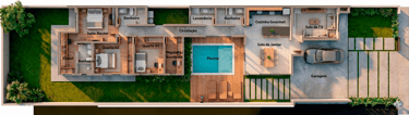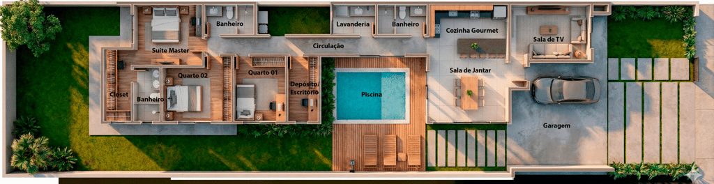 O programa contemplou três dormitórios — incluindo uma suíte com closet — sala de estar, escritório, dois banheiros de uso comum, lavanderia, garagem espaçosa e uma cozinha gourmet integrada à área externa com piscina.